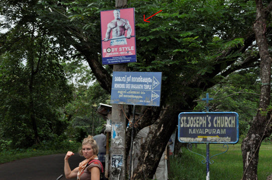 Most signs were in the cities, but this one was in a small village in the southern backwaters. They usually depict a muscle bound (white) guy and a slim, glowing (white) lady with a caption like “SUPER MUSCLE EXTREME SHAPE: with yoga and aerobics for the ladies!” This is telling and hilarious, but what struck me the most came on our last day in India.